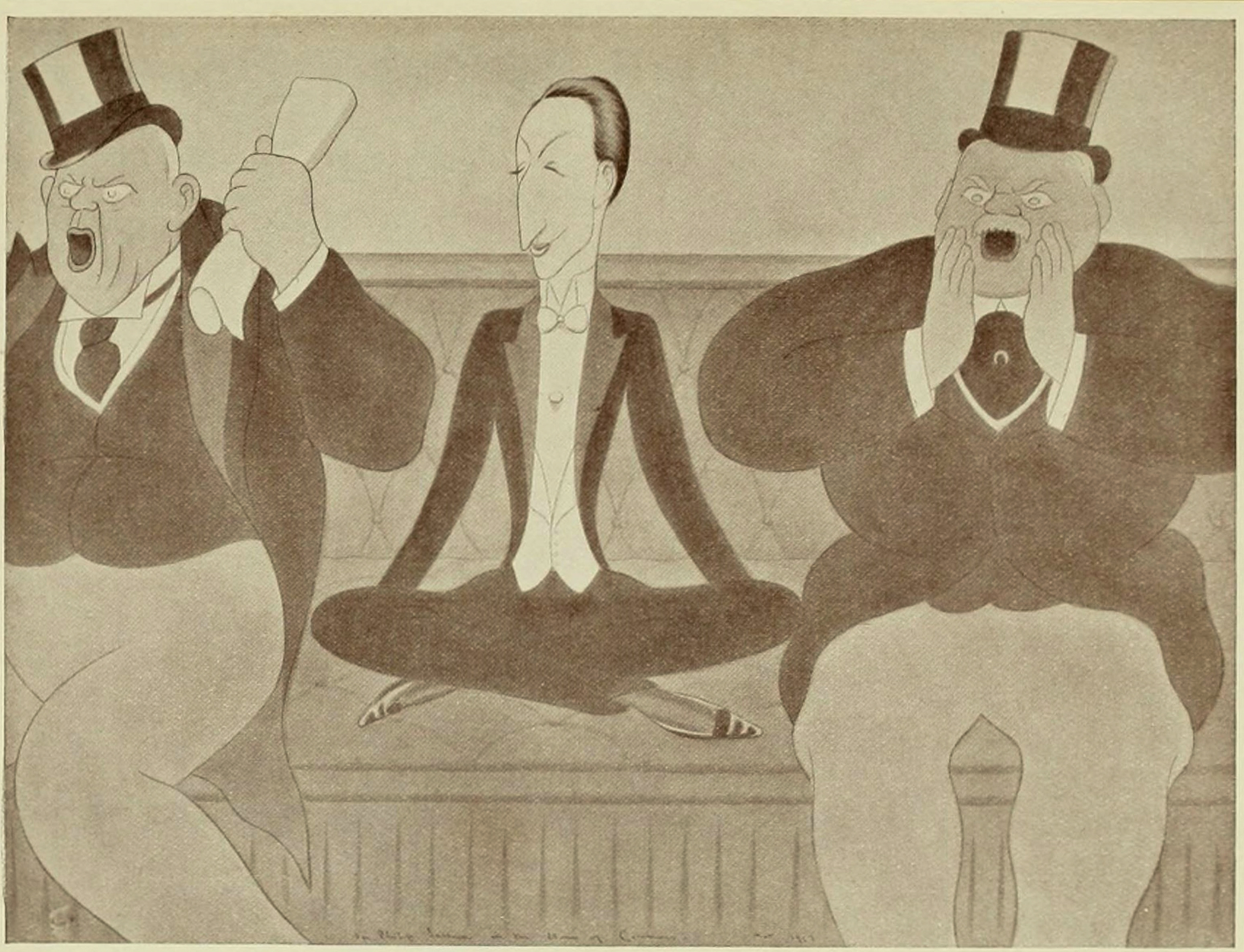 (Below) Philip Sassoon in Strange Company by Max Beerbohm (1913). The title of this caricature references both Sassoon’s Indian origins and his Unionist politics. It contrasts the exotic, cross-legged Jew with the bellowing Conservatives alongside him in the House of Commons.